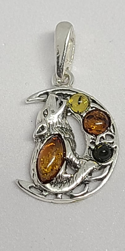 Necklace, Sterling Silver Wolf and Moon with Baltic Amber