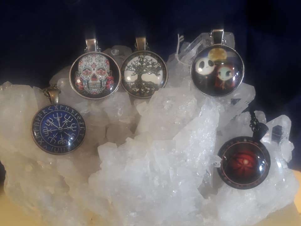 We have a wide verity of picture cabochon pendants. With lots of images to chose from. Some of the topics of the cabs are Religious, steampunk, dragons, pagan, wiccan, animals, artistic and many more. the price is for one. if buying online it is are choice unless you message use or stop in to pick one out you self.