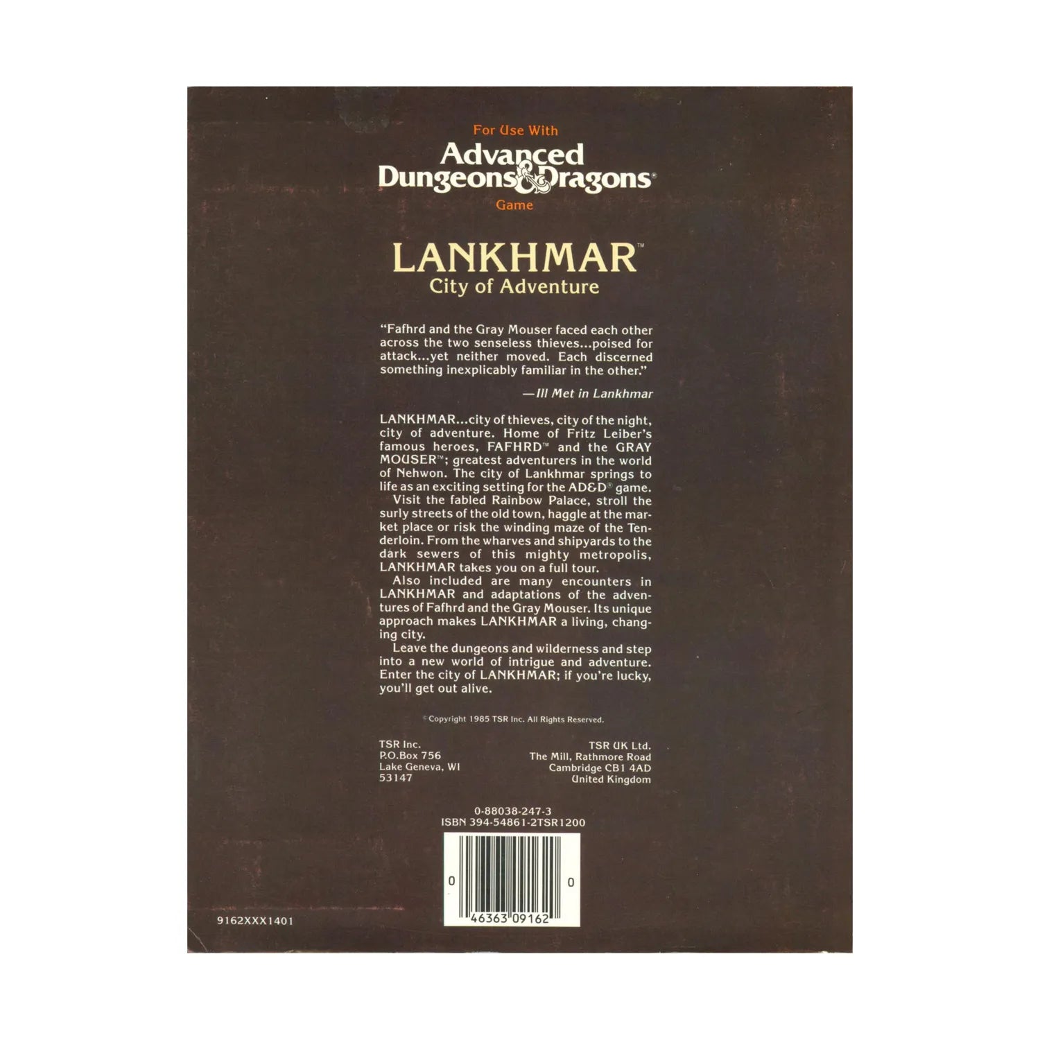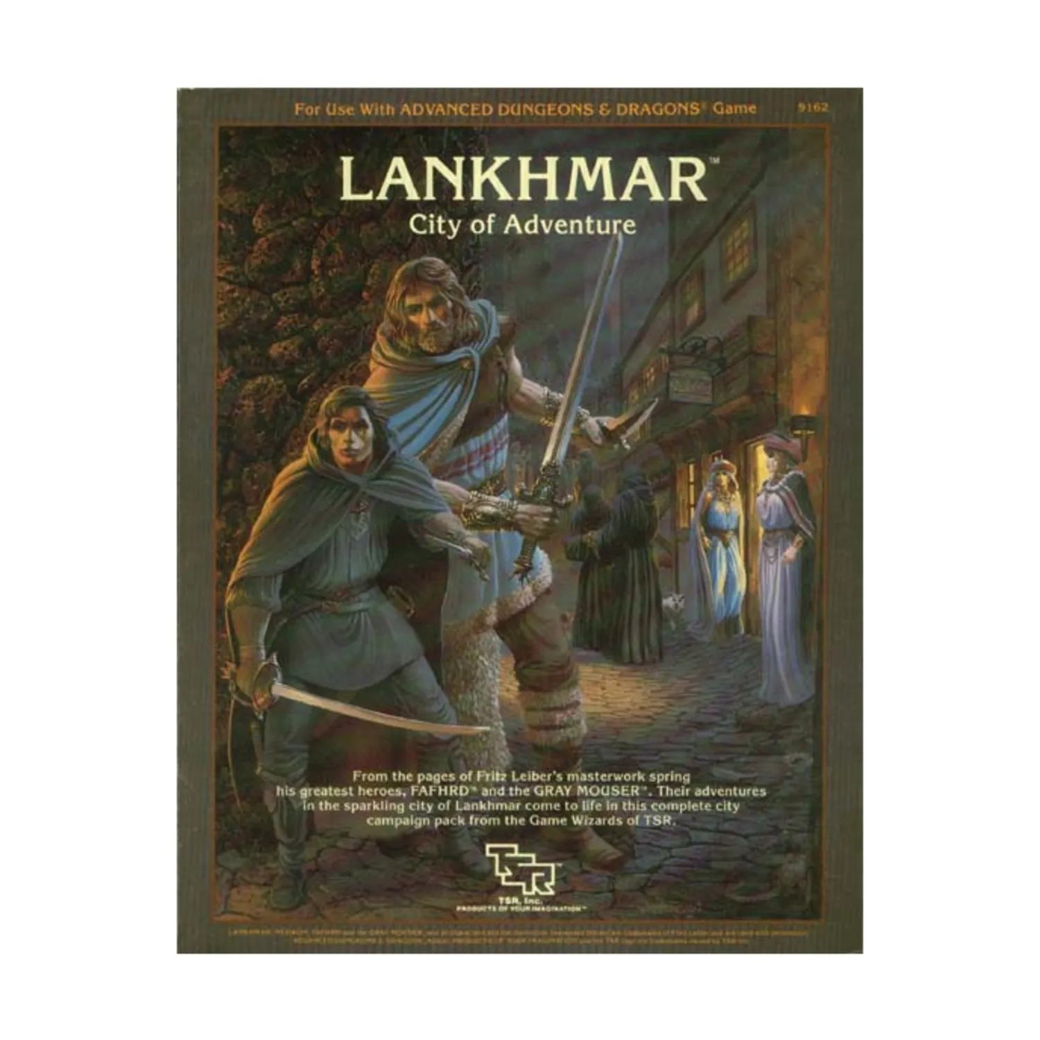LANKHMAR...city of thieves, city of the night, city of adventure. Home of Fritz Leiber's famous heroes, FAFHRD and the GRAY MOUSER; greatest adventurers in the world of Newhon. The city of Lankhmar springs to life as an exciting setting for the AD&D game. Visit the fabled Rainbow Palace, stroll the surly streets of the old town, haggle at the market place or risk the winding maze of the Tenderloin. From the wharves and shipyards to the dark sewers of this mighty metropolis, LANKHMAR takes you on a full tour. Also included are many encounters in LANKHMAR and adaptations of the adventures of Fafhrd and the Gray Mouser. Its unique approach makes LANKHMAR a living, changing city. Leave the dungeons and wilderness and step into a new world of intrigue and adventure. Enter the city of LANKHMAR; if you're lucky, you'll get out alive.