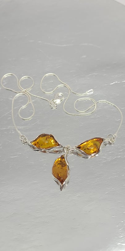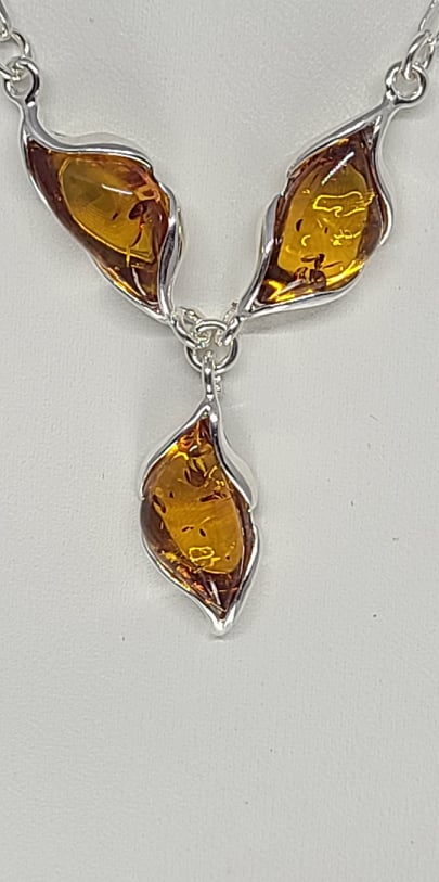 This stylish necklace has a trio of Sterling Silver settings that hold free form Baltic Amber. These freeform designs are a very unique setting, and with the variation of natural Baltic Amber, this is really a one of a kind piece. The clasp for the necklace is a lobster type clasp.