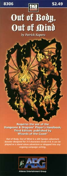 Out of Body, Out of Mind is a d20 System adventure booster designed for 3-5 characters levels 4-6. It can be played as a stand-alone adventure or dropped into any ongoing campaign setting.