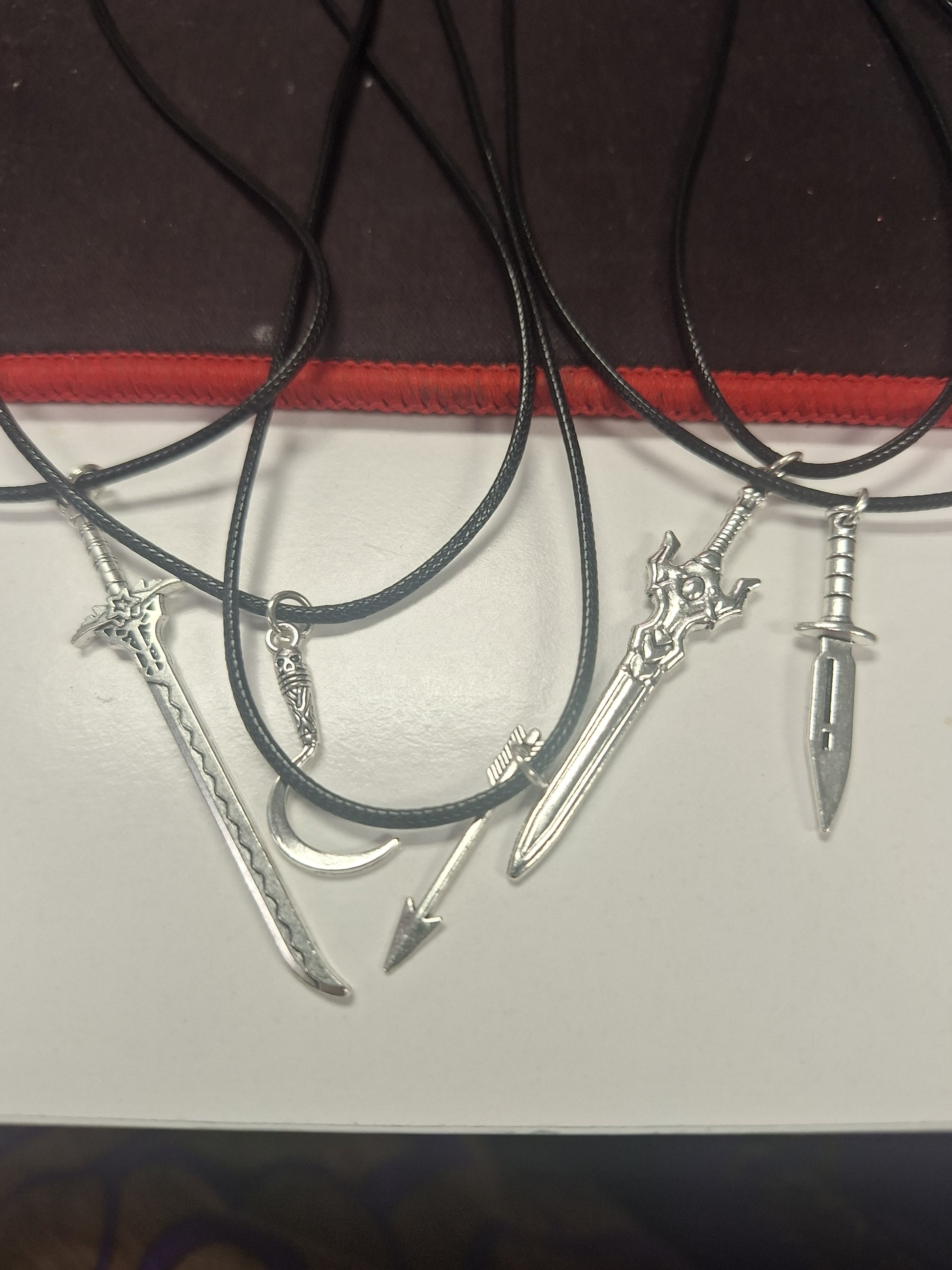 We have a selection of whit metal pendants in the shape of swords and arrows. They come on a black fux leather cord that measures 18" -20"